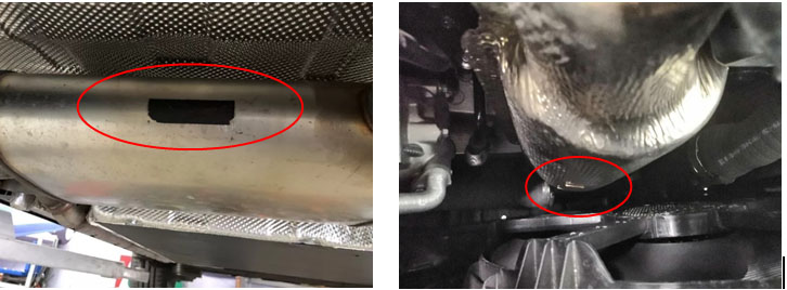 6.检查发现三元催化上的胶纸已经变黄,再次检查消音器上面的胶纸已经发黑