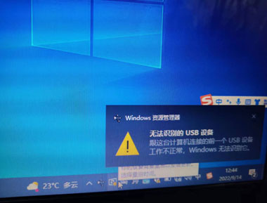 adb线连接TBOX和笔记本电脑,听到“叮咚”一声,笔记本电脑右下角弹出无法识别的USB设备,可以判断TBOX的USB连接口有问题,更换TBOX(正常车不会弹出该提示)