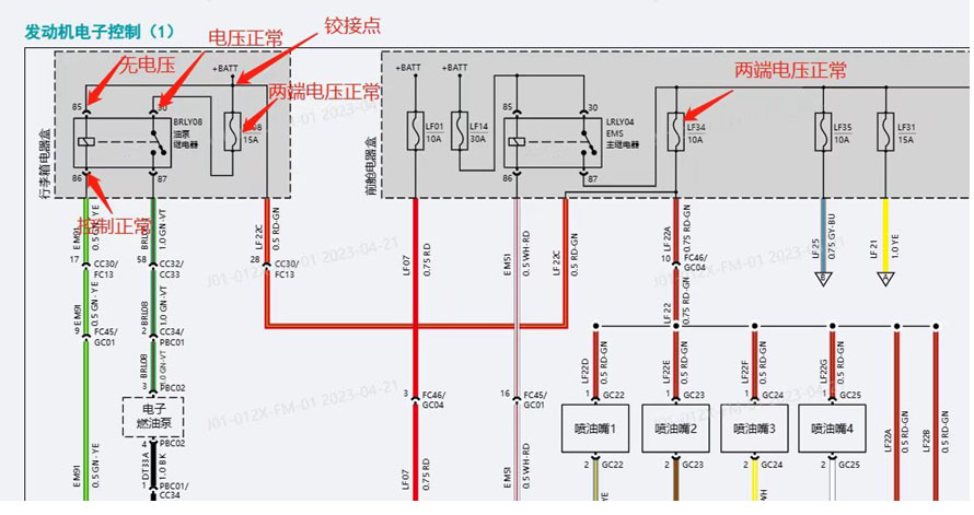 2、检查燃油泵继电器和保险,通过TIS网站查阅,燃油泵继电器和保险丝在后备箱保险盒内,检查保险丝正常,用诊断仪动作测试功能驱动油泵继电器发现继电器无动作。拔下继电器测量继电器座各针脚电压情况,根据电路图油泵继电器的30#和85#pin常电源 ,86#是由EMS模块控制低电平回路,然而测量出来30#电压正常,85#无电压。诊断仪驱动继电器打开时86#控制回路正常(说明模块控制正常)。根据以上初步判断继电器85#没有电压导致。