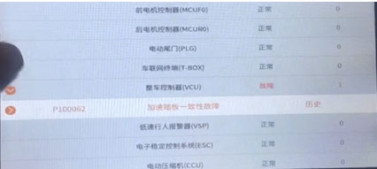 1、路试测试发现车辆电门踩到底车辆最高时速只能到达30km/h,诊断仪读取故障信息,发现VCU报加速踏板一致性故障故障。