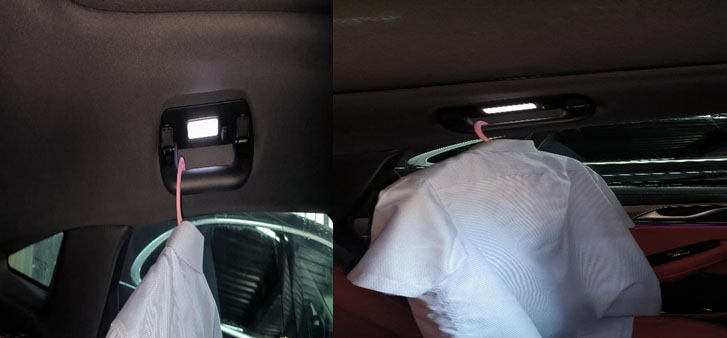 4、多上一人在后排去听声音判断声源的位置,发现声音从左后侧发出来的,同时发现左后排安全拉手上客户挂了一件衣服,将衣服取下来声音消失,判断为衣架在车辆状态变化时因为惯性使衣架和安全拉手发生摩擦产生滋滋的声音;