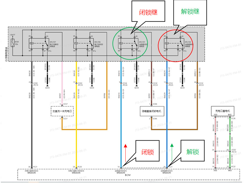 BCM控制继电器工作来实现电机解闭锁,我们习惯看供电,但也要看搭铁情况,要保证电路一整套回路。另外我们点大屏加油口按键,IVI会通过网络传给