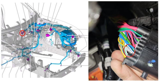 4.再次测量左右大灯之间前位置灯使能信号线电阻为无穷大——断路;依次排查线路,发现前舱线束左与前舱线束右插接处针脚退。