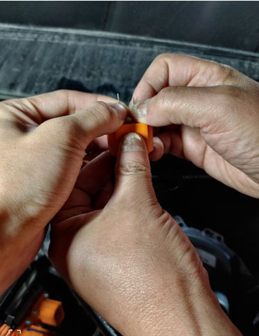 2.断开小电瓶的负极,拆下前舱高压盒上连接仪表台内PTC的高压线束插头,然后准备两根长度一致的大头针(如下图);