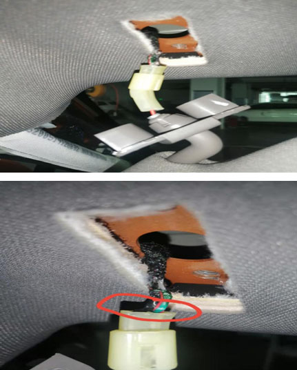 4、更换顶棚线束和左前遮阳板装车故障排除。