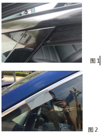 4、将胶布粘贴堵住缝隙后,进行实车验证,发现无口哨声,然后再取下胶布后发现异响又出现(如上图2)