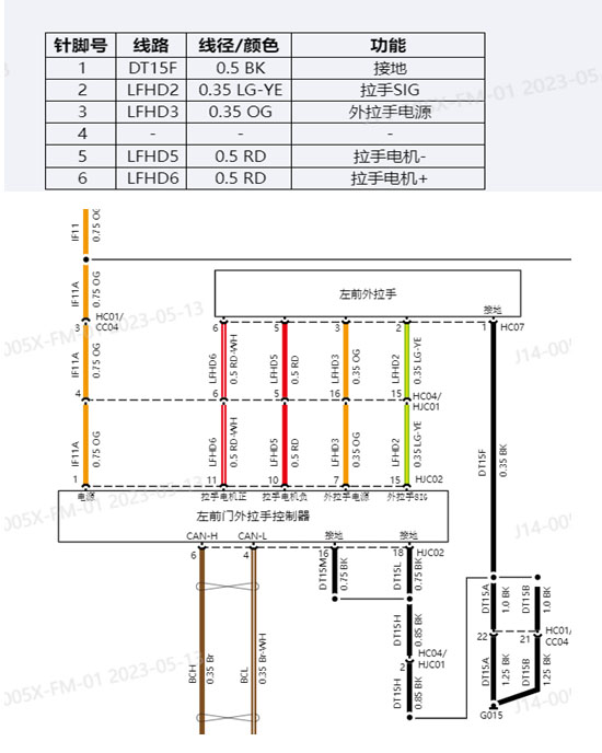2.检查左前门外拉手控制电路,根据电路图检查外拉手控制器供电,控制器插头1号脚电压13.9V电压正常,检查16和18号脚负极正常,检查外拉手控制器到外拉手控制线路,测量外拉手插头1号脚负极正常,3号针脚13.8V供电正常,