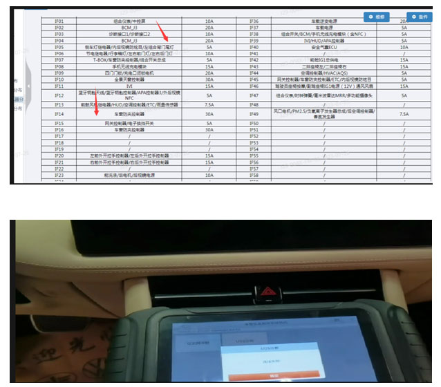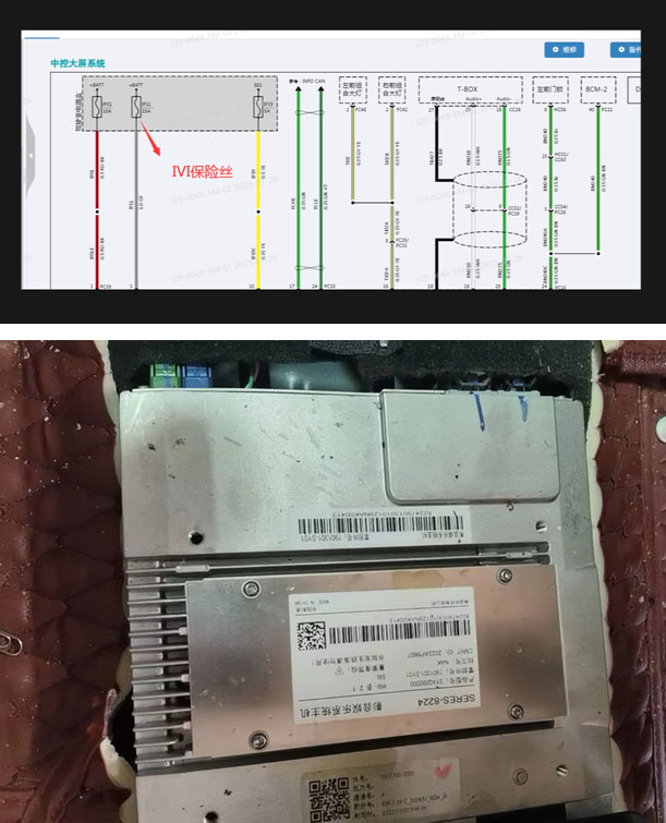 2.检查IVI险丝IF11正常,检查仪表及中控屏保险丝IF01正常,怀疑是IVI损坏或者是线路问题,出现中央通道检查 发现IVI表面有液体,确认是IVI被不明液体腐蚀导致。检查IVI到保险丝及其他线路正常。