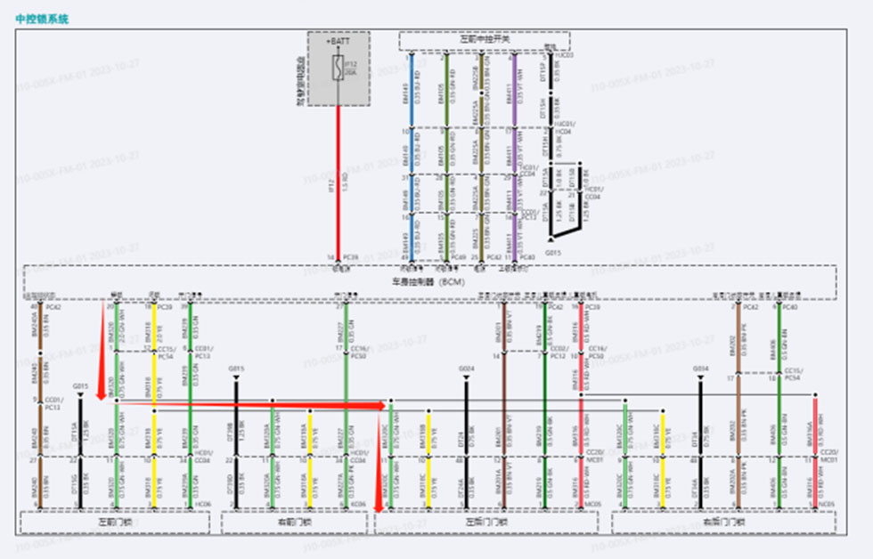 BCM 3#插头(PC39),20#针脚出来控制四门解锁。测量时,先测试了解锁时的电压,有信号电压,但是还需要检测20#针脚到左后门锁的4#针脚是否导通,排除虚接的可能。测量时,选择分段测量,以B柱插件为界,一分为二。一端到锁块插头,一端到
