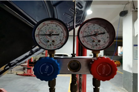 3.连接压力表,高压显示1.1MPa,低压0.7 MPa。低压高于正常0.15-0.3 MPa范围,高压低于正常1.5-2.0 MPa;下图1