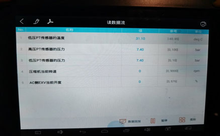 4.使用诊断仪读取AC数据流,高低压力值均为0.74MPa,压缩机转速0,AC侧EXV阀当前开度0;下图2