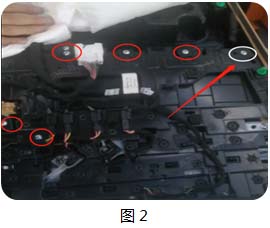 3、拆卸门内衬进行检查,对门内衬固定螺丝排查,发现标白圈的螺丝松动(如图2),紧固螺钉后恢复正常。