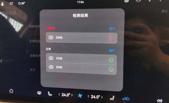 判断:在大屏里面用检测模式,检测车上的三个摄像头,发现DMS人脸识别摄像头报故障,推测摄像头有问题,倒换试驾车的DMS上去试车,也是第一次可以录入成功,过几分钟就录入失败,排除了摄像头问题。