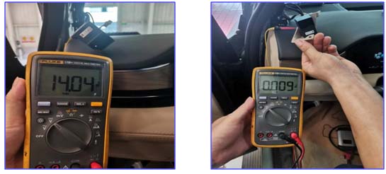 排除了DMS,接下来检查线路,发现每次重启IVI后,能正常录入人脸的时候,摄像头供电电源有14V电压,过几分钟不能录入人脸的时候,供电电压只有0.009V,没有电压,而且DMS摄像头内没有红点闪烁;推测是DMS供电电源有故障。