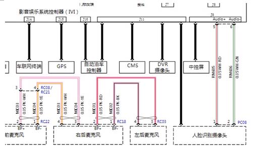 确定软件上没有问题,故障点怀疑在硬件上,与试驾车对换人脸识别摄像头,对换后故障依旧,说明与摄像头没有关系,决定测量线路找到人脸识别摄像头插座PC08根据电路图测量该插座两根线的电压如图