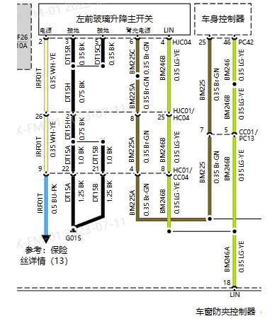测量电动窗主开关插头HJC04的2号端子与接地之间的电压值为0V,正常应该是电源电压12V。