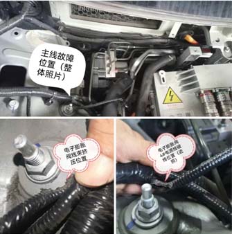 7.重点排查FCR02母端至电子膨胀阀之间线束,找到故障点:电源线被减震螺丝挤压断路。