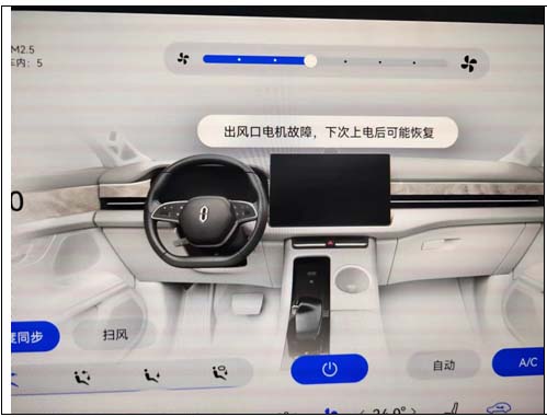 1.首先确认故障现象,当打开空调扫风功能时大屏报警“出风口电机故障,下次上电可能恢复”, 扫风功能失效。