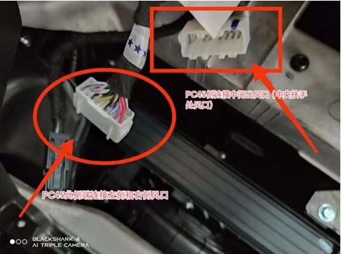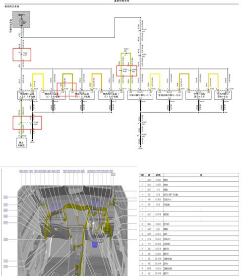从电路图上开PC45插头是出风口扫风左右和中间风口的中间点,经过对地测量发现PC45连接左右侧出风口的LIN线对地导通,PC45连接中间出风口侧LIN线正常,因此确认为左右出风之间的连接线路存在短路(对地打铁),从而对每个左右出风口电机插头断开后分段进行接地导通测量,最终锁定为AC26-PIN3与AC12-PIN2之间存在打铁(对地短路),因此判断问仪表台内线束或者风口电机存在搭铁需拆下仪表台检测线路。\