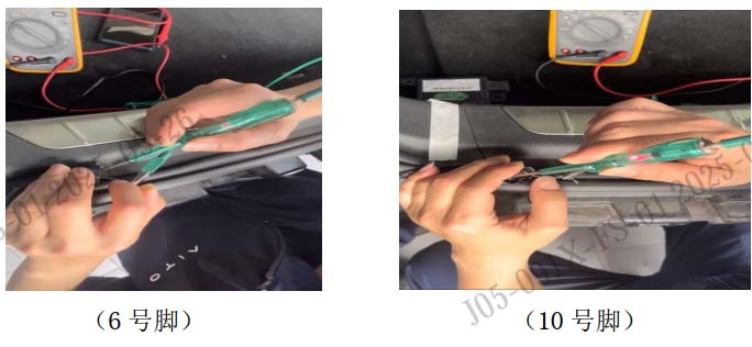 10、重新整车思路, 分析还是车辆线路故障; 用试灯测试 SRR1 电池供电 6 号脚和 IG 电源 10 号脚,发现 6 号脚的供电灯光很暗, IG电源很亮,分析为 6 号脚供电线路存在虚接情况。