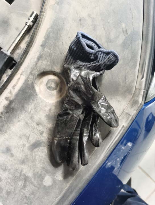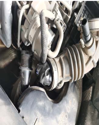 5、打开发动机盖,检查增压管路发现增压管路在增程器启动的情况下被吸扁。拆开空滤发现客户在维修理厂更换过空气滤芯,修理工把手套遗留在空滤上 部,造成吸气 吸入