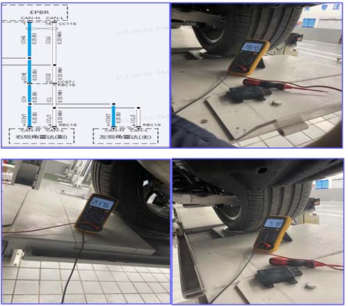 4、 查看电路图,后毫米波雷达是由行李箱电器盒直接供电,测量行李箱电器盒内的BF06保险丝,电压值是14V,但雷达处只有9.27V,说明从行李箱电器盒到RBC18这段线路存在问题,这段线路有两个转接插头:CC94和CC79。