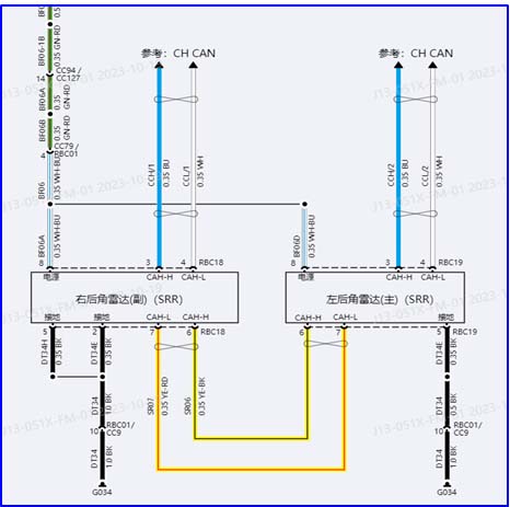 2、 根据故障码定义,查看电路图,先测量SRRR1和SRRR2模块插头的CHCAN通讯线,测量结果:终端电阻,CANH和CANL电压值都正常,CANH和CANL也没有对地短路和对电源短路