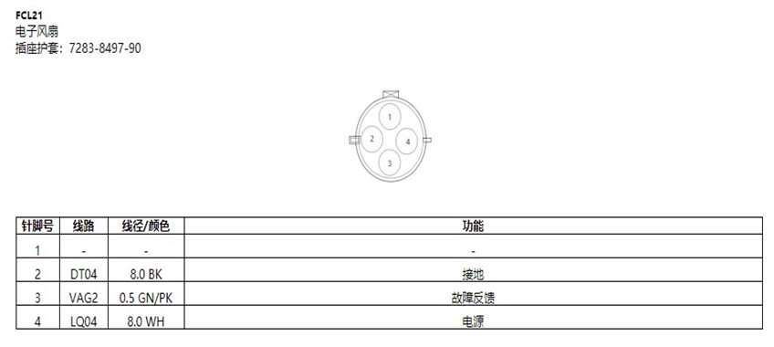 3、查询电路图测量风扇4脚电压13.6V,2脚接地正常,驱动风扇情况下3脚控制信号为2.19V;至此怀疑风扇故障。