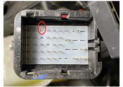 4.测量EMS通往DMTL泵之间的连接线电阻,发现EU97这个脚电阻无穷大,依次排查发现左前舱线束连接发动机线束插接件处EU97针脚歪斜。