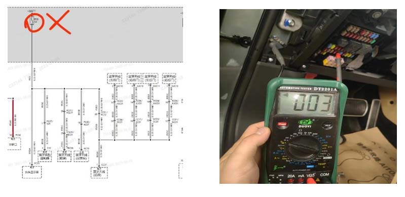 3.分析:IF05保险丝下挂抬头显示以及蓝牙系统,短路可能出现在插头针脚歪脚,线路,模块等。本着由易到难方法,用万用表测量IF05保险丝负载端对地电阻,先将抬头显示器插头拔掉,故障依旧,排除抬头显示器故障;