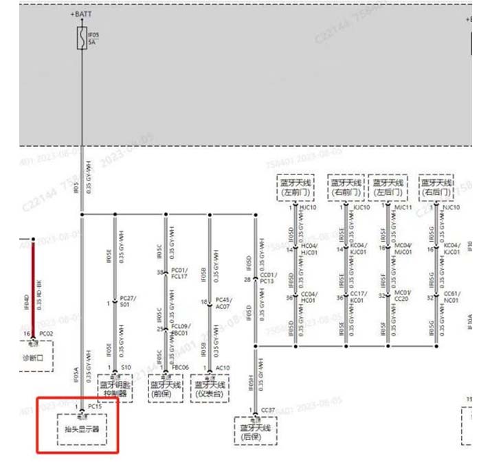 2.查看电路图册BLE/HUD有共用保险丝IF05,检查驾驶室保险丝IF05,发现IF05熔断,测量保险丝负载端对地电阻,保险丝负载端对地短路;