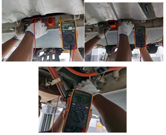 3、电池包前端高压接插件正极/负极分别对MSD两端的电压值均是约184.4V/184.4V;电池包后端高压接插件正极/负极分别对MSD两端的电压值均约188.8V/188.9V;电池包前端正负极之间电压值约0V;电池包后端正负极之间电压值约0V;MSD两端电压值366.8V;可判断电池包主正主负继电器已粘连;
