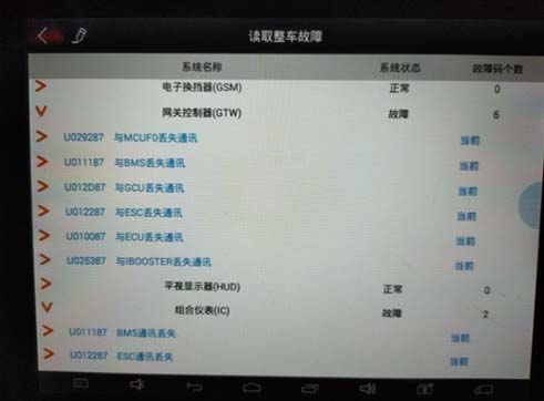 1.先用诊断仪读取故障码,发现大量当前故障码,其中最主要集中在GTW报出一些模块丢失通讯,并且诊断仪无法进入EMS、BMS、GCU、IBOOSTER、MCUF0、OBC、ESC这7个模块;
