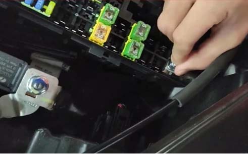4.检查前舱保险盒,发现UEC保险连接线到前舱保险盒的固定螺母非常松动;