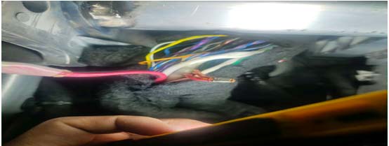 10.重点排查该保险盒上边线路,当拆下仪表保险盒时,发现主线束被挤在骨架内部,已压扁但是未破皮。修复后,试车两天,功能正常,故障排除。