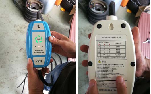 5.检查随车充电枪,发现亮红灯,对照慢充控制盒背面的说明书发现随车充电枪报漏电保护故障