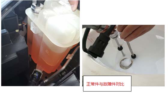 仔细检查发现液位传感器的浮子沉在下面,最终判断液位传感器零件故障(浮子不能正常浮起来),更换新的液位传感器后,故障消失。