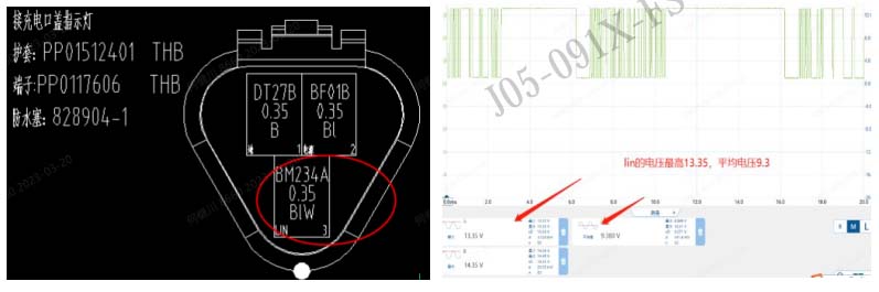 2.1 测量 LIN 线电压、接地,常电情况发现,用万用表测量线束接口 3 脚 LIN电压 9.6V, 1 脚搭铁接地正常, 2 脚常电 12V 正常.