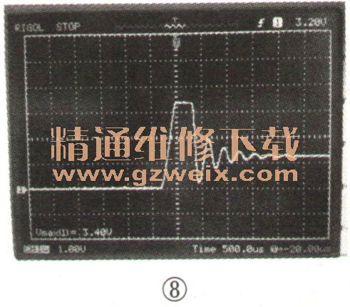 根据上述检查开始检修保护隔离,PU4002要想完全导通PWR CHG ACOK信号必须为高电平,如图6所示。PWR CHG ACOK信号受控于充电芯片的⑤脚(ACOK#),经测量⑤脚输出电压为低,PQ4006截止,PWR CHG ACOK信号被3D3V AUX S5信号拉升为高电平,3D3V AUX S5来自待机芯片的3V线性电压,也就是说3V线性电压输出正常,那么大电流的公共点就产生了,如图7所示。用示波器监测3V线性电压,波形如图8所示,表示瞬间有3V然后马上掉电,这种情况基本是因为EC芯片电压被拉低,拆下EC 、3V线性恢复正常,大电流的公共点也产生了,待机电流为0.01A也正常,把3V、5V开启的控制管拆除,3V、5V待机电压也恢复正常,找了只Intel HM65型号的桥,通过BGA封装换上后,笔记本不触发。