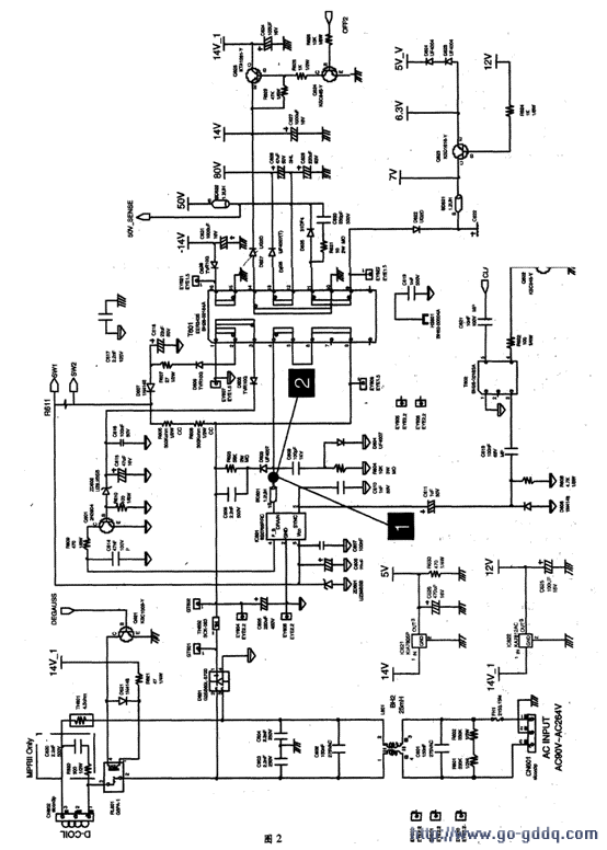 开关管工作后,T601各个绕组上输出的脉冲电压经整流滤波后得到多种直流电压,为相应的负载供电。(1)-(2)绕组输出的脉冲电压经D606整流,R607限流,C618滤波获得33V左右的直流电压,再通过D607取代启动电路为IC601提供完成启动后的工作电压。由(9)-(10)绕组产生的脉冲电压经D622整流、C622滤波获得7V电压,为Q623供电。由(10)-(11)绕组产生的脉冲电压经D625整流、C629滤波获得50V电压,除了为行输出电源供电,还为微处理器提供检测电压50V_SENSE。由(12)-(13)绕组产生的脉冲电压经D626整流,C628、C629滤波获得80V电压,为视频输出放大器等电路供电。由(10)-(14)绕组产生的脉冲电压经D627整流、C627滤波获得14.5V(图标为14V)电压,该电压一路经IC621稳压获得5V电压。为微处理器和存储器等电路供电;另一路为Q625供电。由(15)-(16)绕组产生的脉冲电压经D628整流、C631滤波获得14.5V(图标为-14V)电压,为场输出电路、显像管消磁电路供电。
