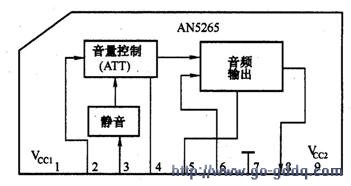 音频功放电路由N201 (AN5625)组成。AN5265是松下公司生产的伴音功放集成电路,内含直流音量控制电路与音频放大输出电路及静音控制电路等。AN5265内部电路框图如右图所示,引脚功能及实测数据如下表所示。