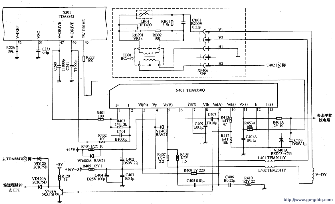TDA8843的(46)、(47)脚提供差分输入信号,加到TDA8350Q的(2)、(1)脚,由(5)、(9)脚输出场频锯齿波电流。本机采用逆程开关式泵电源电路,场扫描正程期间,TDA8350Q(4)脚输入的16V直流电压为场扫描输出级提供电源电压;场扫描逆程期间,45V直流电压由(8)脚进入集成电路,并加到场扫描输出级,缩短了逆程反峰脉冲持续时间,提高了逆程反峰脉冲幅度,降低了场扫描输出级功耗,也提高了电路的热稳定性。