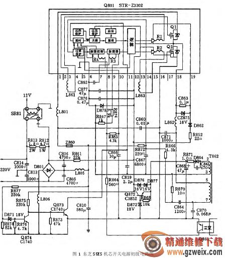 市电220 V交流电压经过R812,R813限流,全桥D801整流,L805,C810滤波后,产生约300 V的直流电压。300 V直流电压经保险器Z860,L801加到Q801的①脚内部的末级推挽输出电路;同时市电 220 V交流经R861降压、D801的左下臂二极管整流、C877,C876滤波产生约16 V的直流电压,送到Q801的12脚内部振荡、稳压电路,作为启动电压。