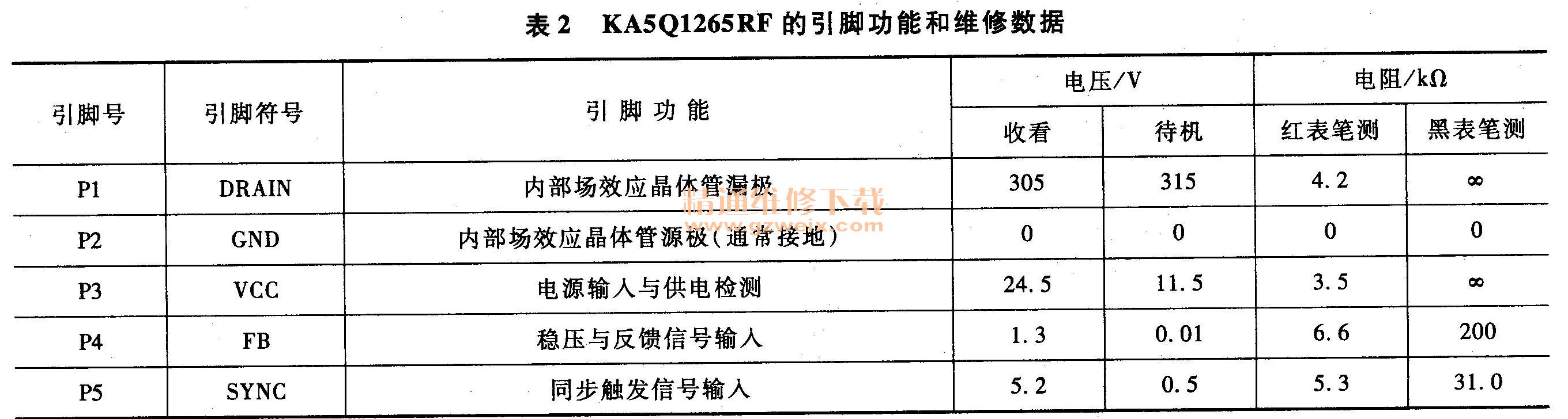 KA5 Q 1265 RF应用于康佳FG, FM, MV, ST, M系列和P2919彩电开关电源中时的引脚功能和维修数据见表2。该集成电路已在第1章介绍过在此不再赘述。内部框图可参考图1-2。
