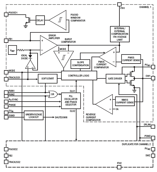 The LTC®3615 is a dual 3A synchronous step-down regulator using a current mode, constant-frequency architecture. The DC supply current is only 130μA (Burst Mode operation