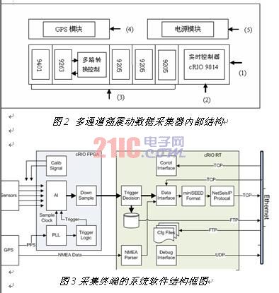 多通道强震数据采集器终端软件主要采用LabVIEW 8.6开发,期间调用了C++语言开发的miniSEED地震数据包封装的动态连接库。数据采集在FPGA和实时(RT)控制器上实现,集成了GPS同步、数字降采样、标定信号的多路转换控制和多种复杂的触发策略等极具挑战性的功能。通信部分的接口中,由数据采集器直接将实时数据流压缩打包成miniSEED格式,并按照NetSeisIP地震数据流的通信协议,发送到远程的地震流服务器或上位机监控分析软件,如图3所示。