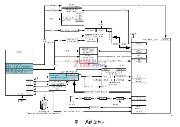 测试系统以工控机为控制平台。由内部的GPIB和串口卡来对外围的可编程仪器的控制;由数据采集卡对测试信号进行采集;DIO (数字输入输出) 对自制夹具内部的继电器切换控制;由直流电源控制电磁阀进行测试气体回路管理;通过网路服务器进行测试数据库,测试报表,登录信息的存储管理;