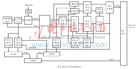 本系统大部分功能通过FPGA实现,使用Verilog编写程序。由于采用的是逐位比较式方案,因此,首先由m序列产生模块产生4.096 Mb/s码率的m序列,送入反相器作为源端。反相器是为了人为产生误码而设置的。当按下按键时,反相器使能,将m序列1位反相后输出,即相当于产生了1个误码。m序列和时钟同时输出给被测系统,经被测系统后再返回给误码测试仪。误码测试仪对输入的m序列和本地产生的m序列进行同步,同步以后,在固定寄存器中置入64位m序列数据。在源端,固定寄存器和移位寄存器不断进行比较,直到两者一致,则启动延时计数器,同时接收端移位寄存器与固定寄存器进行比较,当两者一致时关闭计数器,此时计数器中的数值即为被测系统的延时。另一方面,同步以后,开始进行误码统计。若在设置的测试周期内误码率大于设定的门限值,则认为失步,重新开始同步。最后,将误码数和系统延时数通过SPI接口送给单片机,进行误码率和系统延时的计算,将计算结果显示在LCD上。SPI接口是通过软件进行模拟的。整个FPGA内部的模块框图如图4所示。