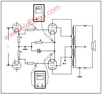 全部电压电流检查无误后,即可注入音频信号进行测试。先将音量控制电位器置于中间位置,检查输入端子插口与插座是否接触良好,输人端子至输入电子管栅极的金属屏蔽线是否有短路与开路现象,输入电子管与插座是否接触好,一切检查无误后,如注入信号仍无声息时,则须从下一级进行检查。