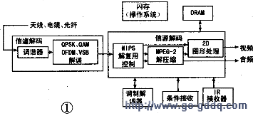 (1)物理层和连接层包括高频调谐器,QPSK、QAM、OFDM、VSB解调,卷积解码,去交织,里德-索罗门解码。去能量扩散。